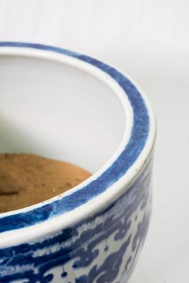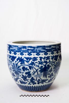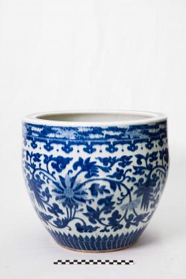 เป็นเครื่องใช้ในเรือพระที่นั่งมหาจักรี ใช้เทคนิคเขียนสีคราม ลายเมฆและดอกไม้