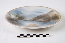 เครื่องใช้ในเรือพระที่นั่งมหาจักรี ผลิตในประเทศอังกฤษ จุดเด่นของวัตถุคือ มีภาพเขียนสีทิวทัศน์