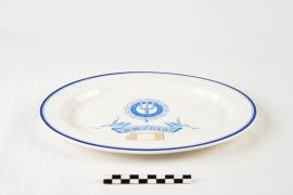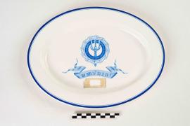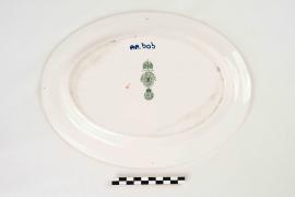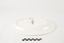 เป็นเครื่องใช้ในเรือพระที่นั่งมหาจักรี จานเปลสำหรับอาหารคาว กลางจานพิมพ์ตรามหาจักรี ด้านหลังประทับตราห้างแบดแมน