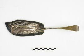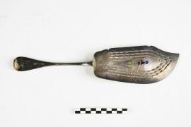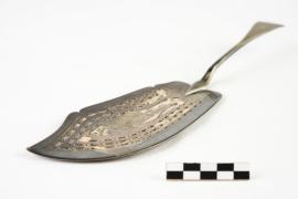 เป็นเครื่องใช้ใน ร.ล.มกุฎราชกุมาร กลางมีดทำฉลุเป็นรูปปลา ปลายด้ามจับสลักตราราชนาวี