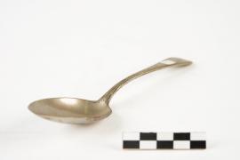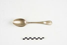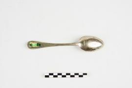 เครื่องใช้ส่วนพระองค์ของสมเด็จพระเจ้าบรมวงศ์เธอ เจ้าฟ้าบริพัตรสุขุมพันธ์ กรมพระนครสวรรค์วรพินิต ปลายด้ามสลักตราราชสกุลบริพัตร ใช้สำหรับอาหารหวาน