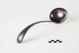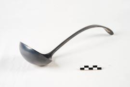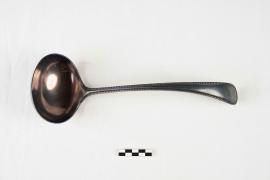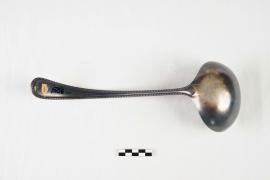 เป็นเครื่องใช้ในเรือพระที่นั่งมหาจักรี ทัพพีขนาดกลาง ปลายด้ามสลักตรามหาจักรี