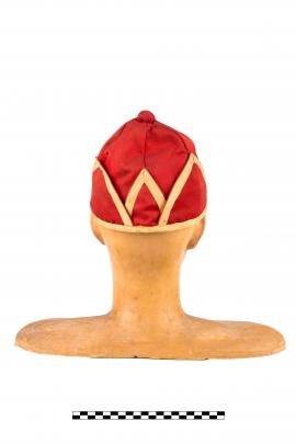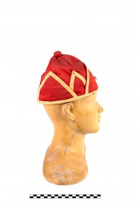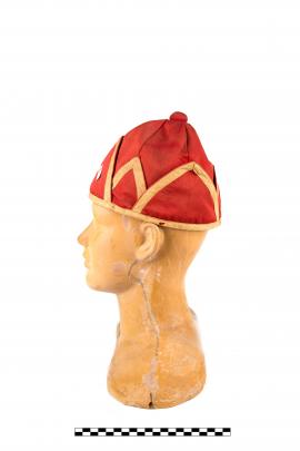 หมวกกลีบลำดวนแดงขลิบเหลือง เครื่องแต่งกายในกระบวนเรือพยุหยาตราทางชลมารค ตำแหน่ง พนักงานตีกลอง เรียกว่า กลองชนะ