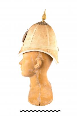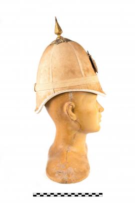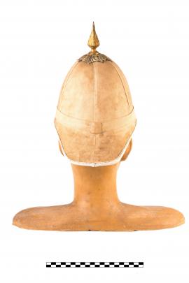 หมวกมหาดเล็กรักษาพระองค์สีขาว มีสัญลักษณ์ตราแผ่นดินหน้าหมวก สมัยรัชกาลปลายรัชกาลที่ ๔- รัชกาลที่ ๕ ลักษณะสมัยนิยมตามแบบยุโรป