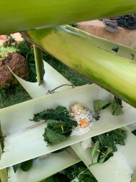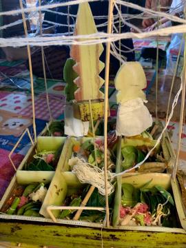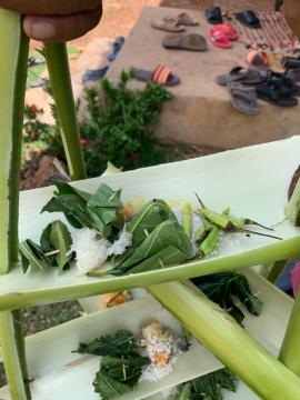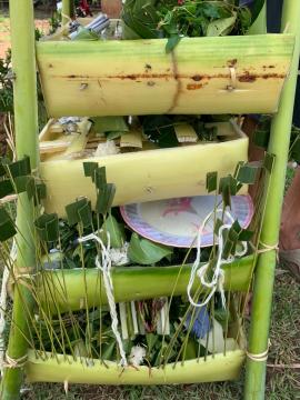 พิธีเสียเคราะห์ มีองค์ประกอบที่สำคัญ คือ กระทงจากกาบกล้วย อาจเป็นกระทงสามเหลี่ยมหรือสี่เหลี่ยมแล้วแต่ชนิดของการเสียเคราะห์ พื้นกระทงปูรองด้วยใบตองกล้วย นำกาบกล้วยทำเป็นห้องและชั้น สำหรับวางเครื่องสักการะต่าง ๆ