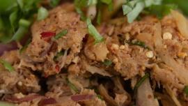 เบาะ ละ ฮอง สวาย เหมือน หรือก็คือตำไก่ใส่มะม่วง อาหารพื้นถิ่นที่หากินไม่ง่าย หากสนในอยากรับประทานต้องสั่งให้จัดทำเฉพาะเท่านั้น เมนูนี้จัดเสิร์ฟที่ฐานการเรียนรู้เชฟชุมชน ส่วนผสมหาได้ในท้องถิ่น เป็นเมนูอาหารเรียบง่าย รสชาติจัดจ้าน อีกหนึ่งเมนู หน้าตาคล้ายลาบแต่ไม่ใช่ ส่วนผสมประกอบด้วย ไก่บ้านย่าง ข้าวคั่ว มะม่วงเปรี้ยว พริกซอย พริกป่น หอมแดง กระเทียม ผักชีใบเลื่อยและน้ำปลา วิธีทำแสนง่าย แต่รสชาติก็แสนอร่อย ได้ชิมเป็นต้องติดใจ วิธีทำมีเพียงสามขั้นตอนหลักคือ นำเนื้อไก่ยางมาโขลกให้ละเอียด จากนั้นเติมข้าวคั่ว มะม่วง หอมแดง กระเทียม โขลกคลุกเคล้าให้เข้ากัน ปรุงรสตามที่ต้องการ ใช้ผักชีใบเลื่อยแต่งจานหรืออาจจะตำรวมกับเครื่องปรุงอ่อนเพื่อเพิ่มความหอมของอาหาร เพียงนี้ก็เสร็จพร้อมเสิร์ฟ