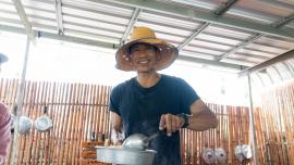 ชื่อเมนูอาจจะฟังดูธรรมดาแต่ความอร่อยระดับภัตตาคารอาหาร 5 ดาว ที่ใครทานก็ต้องหลงรักในน้ำซุปร้อน ๆ หอมกลมกล่อม และรสชาติอร่อยลงตัว วัตถุดิบหลักคือ “ลูกรอก” หรือไส้กรอกไข่ อาหารไทยชาววังที่ได้รับความนิยมในสมัยก่อน ด้วยความวิจิตรบรรจง ประดิดประดอย ที่เป็นเอกลักษณ์ของอาหารไทยชาววัง ผ่านกระบวนการคิดและปรุงอย่างชาววังออกมามีหน้าตาเหมือนลูกรอก (ลูกเหล็กกลมแบนคล้ายล้อที่มัดไว้กับเชือกหรือสายไฟเพื่อชักรอกเคลื่อนย้าย) นิยมนำมาปรุงเป็นแกงจืด แกงจืดลูกรอกของเชฟเพ็ง สืบวัน เชฟชุมชนบ้านโคกเมือง ออกจะต่างแตกจากแกงจืดลูกรอกทั่วไป โดยเชฟเพ็งจะเริ่มจากการตุ๋นกระดูกหมูกับแครอทที่บรรจงแกะสลักคล้ายรูปดอกไม้ และเห็ดหอมจนเนื้อหมูเปื่อยได้ที จะได้น้ำซุปใสสีทองสวยน่ารับประทาน จากนั้นใส่ลูกรอกลงไป เติมเห็ดหูหนูลงไปด้วยเพื่อเพิ่มมิติในการเคี้ยวตอนรับประทาน ปิดฝารอให้เดือดและปรุงรสชาติก็เป็นอันเสร็จสามารถยกเสิร์ฟได้เลย เป็นหนึ่งเมนูแนะนำจากเชฟชุมชนบ้านโคกเมือง ที่รสชาติกลมกล่อม ทานได้เพลิน ๆ อร่อยและมีประโยชน์ทางยาจากเห็ดหอมและเห็ดหูหนูอีกด้วย