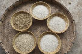 武里南火山土的茉莉香米是茉莉香米的105号品种也是农耕季节在富有矿物的土壤上种植的gorkor 15号品种。,这种香米的米粒细长、有光泽且颗粒饱满。 米饭煮熟后,看起来软而不硬。