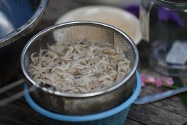 การช้อนกุ้ง คุณตาเคลือบ วูประโคน ทำอาชีพหากุ้ง หอย ปู และปลาจากแหล่งน้ำบริเวณบ้านโคกเมือง จ.บุรีรัมย์ เพื่อนำมาขายที่ตลาดของหมู่บ้านหรือบางครั้งชาวบ้านก็มาซื้อกุ้งหรือปลาจากคุณตาถึงที่บ้าน คุณตาขายถูกมาก คุณตาเคลือบเล่าว่า “บางที่คนมาขอซื้อกุ้ง ตาก็ขายให้เค้าแค่ 20 บาท แต่ได้ไปเยอะเลย” คุณตาเคลือบ สามารถช้อนกุ้งฝอยเพียงคนเดียวได้ เนื่องจากคุณตาทำอุปกรณ์สำหรับช้อนกุ้งขึ้นมา เรียกว่า ช้อนขาคีม (Boat dip net) หรือภาษาถิ่นเรียกว่า “แง่งเจี๊ยด” หรือ “ผ้าช้อน” อุปกรณ์ช้อนกุ้งชนิดนี้ใช้ผ้าไนลอนทำเป็นตาข่าย ซึ่งผืนตาเป็นรูปสามเหลี่ยมหน้าจั่ว ก้นลึก 4-5 เมตร โดยคุณตาเคลือบจะผูกขวดน้ำพลาสติกไว้กลับก้นถุง เพื่อช่วยทราบตำแหน่งของก้นถุงและเพื่อความสะดวกในการใช้งาน ด้ามมือใช้ไม้ไผ่ยาว 4 เมตร 2 อัน ผูกไขว้กันระหว่างกึ่งกลางเป็นรูปกรรไกร แล้วผูกขึงตาข่ายติดกับไม้ด้านหนึ่ง ด้านปลายสุดของส่วนนี้จะผูกติดกับกาบตาลที่เหลาให้มีรูปร่างคล้ายช้อน ส่วนอีกด้านหนึ่งเป็นที่สำหรับถือ วิธีใช้อุปกรณ์ชนิดนี้ คือ ให้คนช้อนจับช้อนขาคีมกดให้ปากช้อนลงในน้ำและยกขึ้นดูเป็นคราวๆ เป็นอุปกรณ์ที่เหมาะกับการช้อนกุ้งบริเวณแม่น้ำ ลำคลอง หรือแหล่งน้ำไหลที่ไม่ลึกมากนัก กุ้งฝอยน้ำจืด (Lanchester’s freshwater prawn) จัดอยู่ในสกุล (Genus) Macrobrachium ที่พบในประเทศไทย ซึ่งเป็นกุ้งฝอยน้ำจืดที่พบทั่วไปในทุกภาคของประเทศไทย มีชื่อวิทยาศาสตร์ว่า Macrobrachium lanchesteri De Man กุ้งฝอยชนิดนี้มีขนาดลำตัวยาวเฉลี่ย 2.8 เซนติเมตร ลักษณะลำตัวใส เปลือกหุ้มลำตัวบางมีสีขาวแกมเขียว กรีสั้น กรีด้านบนมีฟัน 4-7 ซี่ กรีด้านล่างมีฟัน 2-4 ซี่ จัดเป็นแหล่งอาหารจากธรรมชาติที่สำคัญของประชาชนในชนบท สามารถจับจากแหล่งน้ำทั่วไปหรือซื้อหามารับประทานได้เนื่องจากมีราคาไม่แพงนักและมีคุณค่าทางอาหารสูง ชาวบ้านหมู่บ้านโคกเมือง จ.บุรีรัมย์ นิยมนำมาทำกุ้งจ่อม