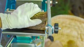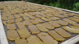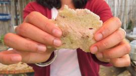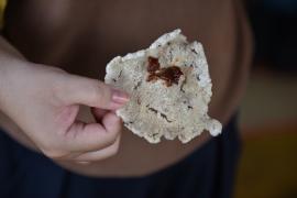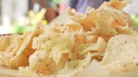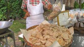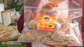 อีกหนึ่งผลิตภัณฑ์ที่มาจากภูมิปัญญาชุนชนบ้านโคกเมือง จากฐานการเรียนรู้ปูนาร่วมกับฐานการเรียนรู้สัมมาชีพภูเขาไฟ ข้าวเกรียบมีส่วนผสมพิเศษที่เป็นเคล็ดลับความหอมอร่อยของข้าวเกรียบคือมันปูเข้มข้น แกะออกจากปูเน้น ๆ จากฟาร์ม นำไปต้มให้สุก และยังมีส่วนผสมลับคือข้าวไรส์เบอรี่บด เพิ่มความหอมและสร้างสีให้กับข้าวเกรียบ ข้าวเกรียบทอดกรอบ ๆ มีกลิ่นมันปูอ่อน ๆ พอให้รูรส ทานกับน้ำพริมมันปูอีกหนึ่งผลิตภัณฑ์ที่ต้อมห้ามพลาดของฐานการเรียนรู้ปูนา เข้ากันมาก ทานเพลินจนแทบหยุดไม่ได้ ต้องกลับมาซื้อซ้ำอย่างแน่นอน ข้าวเกรียบทอดแล้วราคาถุงละ 35 บาท เหมาะกับการซื้อติดไม้ติดมือไปฝากเพื่อนฝูงก็ดี