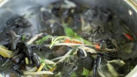 6. ต้มให้สุก แล้วใส่ใบแมงลักก่อนตักเสิร์ฟ