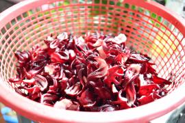 2. ฉีกดอกกะเจี๊ยบเป็นกลีบ ๆ และแกะเมล็ดออก เอาเฉพาะเนื้อ