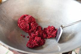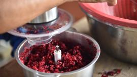 4. นำมาปั่นด้วยเครื่องปั่นแค่พอหยาบ โดยเติมน้ำสะอาดลงไปผสมเล็กน้อย เพื่อให้ปั่นง่ายขึ้น