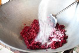 5. ตั้งกระทะและใส่น้ำตาลทราย ลงไปในอัตราส่วน 1: 1 (เช่น เนื้อกระเจี๊ยบ 1 กก. ต่อน้ำตาล 1 กก.)