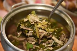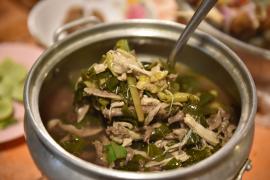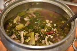 เนื้อไก่บ้านนั้นช่างเข้ากันได้ดีกับใบหม่อนที่คนในชุมชนปลูกไว้ทั่วไปในพื้นที่บ้านสุขสมบูรณ์อย่างไม่น่าเชื่อ หากนักท่องเที่ยวทุกท่านได้ลองชิมเมนูจาก ตายา หรือ ตาอณิสร ฉิมพลี ซึ่งเป็นสูตรของตายาโดยเฉพาะ ทุกขั้นตอนทำจากใจและทำอย่างพิถีพิถันตั้งแต่ขั้นตอนการคัดเลือกไก่บ้านที่เป็นวัตถุดิบหลักและจะนำมาต้มจนเปื่อย เนื้อนุ่ม และฉีกเป็นชิ้น ๆ เล็ก ๆ พอคำ ทำให้ง่ายเวลารับประทาน ก่อนที่จะนำมาทำแกงกับใบหม่อน รสชาติเข้ากันดี คล้ายกับต้มยำแต่รสเปรี้ยวจะอ่อนละมุนมากกว่า เนื่องจากรสชาติเปรี้ยวหน่อย ๆ ในแกงไก่บ้านใบหม่อนนี้ มาจากความเปรี้ยวของใบหม่อนที่จะทำให้แกงหม้อนี้มีรสชาติเปรี้ยวที่พอดีและลงตัวเป็นอย่างมาก หากใครอยากเพิ่มความเปรี้ยว ให้จี๊ดจ๊าดมากยิ่งขึ้น หรืออยากเพิ่มความเผ็ดแซ่บให้ถึงใจ ก็สามารถปรุงเพิ่มเองตามความชอบ ด้วยพริกป่น มะนาว และพริกขี้หนูสวนสด ๆ ที่เสิร์ฟมาเป็นพร้อมกัน