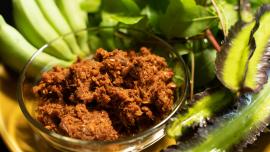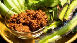 ใครชอบความแซ่บ เผ็ดร้อน เชิญทางนี้จ้า กับน้ำพริกข่าแบบภาคเหนือทานกัน แต่แม่จุ๊ได้นำมาปรับสูตรเป็นน้ำพริกข่าแบบฉบับบ้านสุขสมบูรณ์ เพราะให้วัตถุดิบหลักคือ “ข่า” ที่ปลูกในชุมชน ขอบอกว่าข่าที่นี่ความเผ็ดร้อนมากกว่าสูตรของทางเหนือมากหลายเท่า เหมาะกับทานคู่ผักสด ๆ ได้แก่ กล้วยป่าดิบ ถั่วพู ใบสะเดามาเลหรือมะตูมแขก ใบกะเพรา ยิ่งทานพร้อมข้าวสวยร้อน ๆ เวลาทานทำให้ยิ่งเคี้ยวยิ่งได้กลิ่นของข่าชัดเจนมากขึ้น แถมยังได้ประโยชน์จากคุณสมบัติของข่า ช่วยขับลม แก้ท้องอืดท้องเฟ้อ ท้องเดินและบรรเทาอาการคลื่นไส้อาเจียน