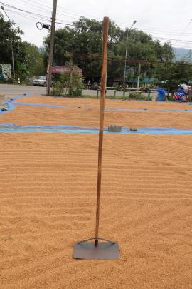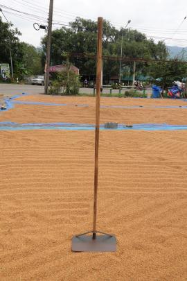 “คราดกวาดลานข้าว” หรือ คฑาโกยข้าว คราดแบน คราดกวาดข้าว เป็นต้น พลิกข้าวมีลักษณะทั่วไปประกอบด้วยด้ามไม้ยาวประมาณ 1.5 เมตร และ ซี่สำหรับใช้คราด ซึ่งตัวคราดนั้นจะทำด้วยไม้หรือคราดที่ทำด้วยเหล็ก โดยทีมีลักษณะแบบคราดแบนเรียบนี้ใช้เพื่อทำการเกลี่ย โกยข้าว และกวาดข้าวเปลือกเพื่อทำการรวมกองเมล็ดข้าวให้ง่ายต่อจัดการ เนื่องจากข้าวเปลือกที่เก็บเกี่ยวได้มานั้นจะมีความชื้นสูงมาก เมล็ดจะมีความชื้นประมาณ 20-25% เมื่อนำข้าวเปลือกมากองรวมกัน เนื่องจากเมล็ดมีการหายใจ จะทำให้กองข้าวมีอุณหภูมิสูงขึ้น เหมาะสมต่อการเจริญเติบโตของจุลินทรีย์ต่างๆ มีผลทำให้ข้าวเสื่อมคุณภาพ เช่น เกิดข้าวเน่า ข้าวบูด ข้าวเหลือง ข้าวมีคุณภาพการสีต่ำ เมล็ดพันธุ์เสื่อมความงอกเร็ว ทั้งนี้เพื่อให้ได้เมล็ดข้าวเปลือกที่แห้ง เมื่อนำไปตากเกษตรกรจะต้องทำการเกลี่ย โกยข้าว และกวาดข้าวเปลือกเพื่อทำการรวมกองเมล็ดข้าว ชาวนาจะใช้คราดกวาดลานข้าวใช้เป็นเครื่องทุ่นแรงเพื่อเกลี่ย โกยข้าว และกวาดข้าวเปลือกข้าวเปลือก การตากข้าวมีจุดประสง์ให้ข้าวเปลือกมีความชื้นของเมล็ดประมาณ 13-15% ซึ่งวิธีการตากแดดนี้มีต้นทุนที่ไม่สูงทำให้เกษตรกรโดยส่วนใหญ่ใช้วิธีนี้ในการลดความชื้นข้าวเปลือกโดยการตากแดดบนลานคอนกรีต ซึ่งหลักการนี้จำเป็นต้องอาศัยความร้อนที่เกิดขึ้นจากพลังงานแสงอาทิตย์ ในการในความร้อนดังกล่าวเป็นตัวการสำคัญที่ทำให้น้ำและความชื้นภายในข้าวเปลือกเกิดระเหยออกมาจากข้าวเปลือกในลานตากข้าวค่อยใช้คราดกวาดลานข้าวเพื่อทำการรวมกองเมล็ดข้าวต่อไป