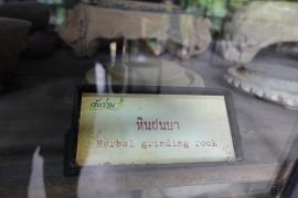หินฝนยา เป็นแท่นหิน มีแอ่งอยู่ปลายด้านหนึ่งเพื่อรองรับตัวยาและน้ำยา ใช้สำหรับฝนยาหมู่ เช่น นวเขี้ยว หรือฝนตัวยาเพื่อทำน้ำกระสายยา ปัจจุบันมีเครื่องมือที่ทันสมัยสะดวกและรวดเร็วเข้ามาแทนที่ การใช้จึงไม่ค่อยมีให้เห็นแล้ว ซึ่งได้จัดแสดงที่ “ศาลายา” พิพิธภัณฑ์มรดกไทยทางด้านยาแผนโบราณ ภายในรวบรวม ในด้านประวัติศาสตร์ วิถีชีวิต ตำรับยา ตู้ใส่วางยา และสิ่งของที่ใช้ในการทำยาแพทย์แผนไทยและการแพทย์ทางเลือก ยาสามัญประจําบ้าน สมุนไพรหายาก ใกล้สูญพันธุ์ ที่มีคุณค่าต่อการศึกษาด้านการแพทย์แผนไทยและสมุนไพร เป็นแหล่งการศึกษา ค้นคว้า วิจัย และเผยแพร่ความรู้เกี่ยวกับวิถีชีวิตของคนท้องถิ่นที่เกี่ยวข้องกับสมุนไพร และการแพทย์ของท้องถิ่น ณ บริษัท วังน้ำเขียวฟาร์มอินเตอร์ จำกัด ซึ่งส่วนหนึ่งของความหลากหลายจากบ้านสุขสมบูรณ์