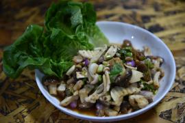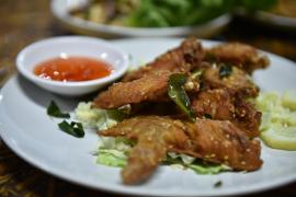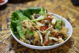 ชี้เป้าร้านอาหารเด็ดแห่งบ้านสุขสมบูรณ์ ซึ่งร้านที่อยากแนะนำคือ ร้าน “ภัตตาคารบ้านไร่” ตั้งอยู่ห่างจากห้วยขมิ้นไม่ถึง 1 กิโลเมตร บรรยากาศของร้านเป็นแบบสไตส์ลูกทุ่ง เมนูส่วนใหญ่เป็นแบบอาหารไทยตามสั่ง ทางร้านจะมีเมนูแนะนำ ได้แก่ ไข่เจียวกรอบเห็ดหอม ผัดเห็ดรวมน้ำมันหอย ผัดเผ็ดหมูป่า คั่วกลิ้งซี่โครงหมู ไก่ทอดเกลือ และยำคอหมูย่าง ซึ่งอร่อยทุกจานจริง ๆ ส่วนตัวอยากให้ทุกท่านได้มาลองชิมไก่ทอดเกลือที่รสชาติอร่อยเข้าเนื้อมากทีเดียว โดยทางร้านจะพยายามใช้ผักและวัตถุดิบที่ปลูกในพื้นที่ของชุมชน เช่น เห็ดหอม หน่อไม้ดอง ทำให้เมนูแต่ละจานอร่อยและราคาย่อมเยามาก เปิดบริการทั้งมื้อกลางวันและมื้อเย็น สนใจสอบถามลายละเอียดได้ที่ คุณตุ๊ก โทร. 093-3259589 หรือคุณไก่ โทร. 061-1143829