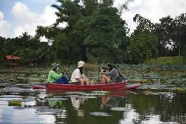 นักท่องเที่ยวที่อยากสัมผัสวิถีชุมชน สัมผัสบรรยากาศสดชื่นของห้วยขมิ้น พร้อมถ่ายรูปสวย ๆ บนเรืออยากมีประสบการณ์การเก็บบัว แล้วนำไปทำอาหารรับประทานพร้อมกับคนในชุมชน สามารถทำได้ที่นี่ บ้านสุขสมบูรณ์