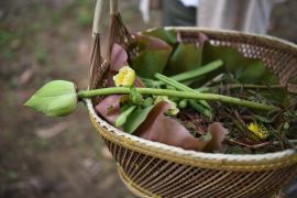 ห้วยขมิ้นเมื่อปีก่อน ๆ มีบัวแดงเยอะมาก และคนในชุมชนได้อาศัยเก็บบัวแดงไปทำกับข้าว ซึ่งอาหารที่ใช้บัวเป็นองค์ประกอบเป็นอาหารพื้นถิ่นที่ชาวบ้านชอบรับประทานเช่น เอาไปรับประทานกับส้มตำ เอาไปจิ้มน้ำพริก ทำแกงส้ม แกงกะทิ ทำอาหารได้หลากหลาย ซึ่งทางชุมชนพบว่ากิจกรรมการเก็บบัวแดงเป็นกิจกรรมที่ควรชักชวนให้นักท่องท่องได้ทำ เพื่อสัมผัสวิถีชุมชนของบ้านสุขสมบูรณ์ ในภายหลังพบว่าบัวแดงมีจำนวนลดลง เนื่องจากมีการรบกวนจากจอกแหน โดยธรรมชาติของบัวจะชอบน้ำใสสะอาด หากน้ำสกปรกจะทำให้บัวตาย ชุมชนจึงได้วางแผนหาบัวมาปลูกเพิ่มเติม ซึ่งการปลูกบัวต้องปลูกหน้าแล้ง ที่ยังมีน้ำไม่เยอะ แล้วบัวจะค่อย ๆ โตขึ้น โผล่พ้นน้ำ เมื่อน้ำยิ่งลึกยิ่งจะได้สายบัวยาว ทางชุมชนวางแผนจะปลูกบัวให้เป็นทุ่งสวยงาม โดยเฉพาะห้วยขมิ้นคือไฮไลท์ของชุมชนอยู่แล้ว ทุ่งบัวในห้วยขมิ้นจะส่งเสริมให้พื้นที่นี้น่าดึงดูดนักท่องเที่ยวมากยิ่งขึ้น