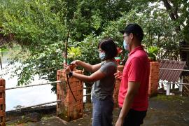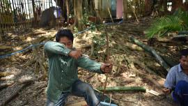 3. ตัดไม้ไผ่ท่อนเพื่อทำด้ามจับ เหลาให้เฉียงบริเวณหัวท้าย