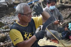 2. เหลาแต่งไม้ไผ่ให้ได้โคนใหญ่ ปลายเรียวขนาดความกว้างครึ่งหนึ่งของโคน