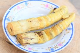 1. ตัดไม้ไผ่เลี้ยงให้มีความยาว 1 เมตร (เลือกตรงโคนของไผ่ที่มีลักษณะค่อนข้างตรง) ผ่าครึ่งตามยาวตลอดแนว