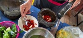 ปูไข่ตะกายดาว : เมนูชนะเลิศการประกวดอาหารพื้นถิ่น จังหวัดตราด ประจำปี พ.ศ. 2558 รสชาติเด็ดขาด การทำไม่ยุ่งยาก โดยกรรมวิธีการประกอบเมนูนี้ เริ่มจากการนำปูทะเลที่มีไข่ภายในกระดอง มาแช่ในช่องแข็งเป็นเวลา 1 คืน จนกระทั้งเนื้อปูแข็ง หลังจากนั้นนำปูออกจากตู้เย็นแล้วแกะกระดองออกให้เหลือเพียงเนื้อที่มีไข่ในกระดอง โดยคงส่วนด้านในกระดองที่กั้นเนื้อปูไว้ พักไว้สักครู่เพื่อให้เนื้อปูหายเย็น ระหว่างที่พักเนื้อปูทำการตำน้ำจิ้มซีฟู้ดซึ่งประกอบด้วยกระเทียม พริกขี้หนู เกลือ น้ำตาลปี๊บ มะนาว น้ำต้มสุก ปรุงรสชาติตามที่ชอบ แล้วทำการแบ่งออกใส่ถ้วยเพื่อใช้เป็นน้ำจิ้มส่วนที่เหลือพักไว้ หลังจากนั้นนำเนื้อปูที่พักไว้มาสับให้ละเอียดแล้วทำการผสมน้ำจิ้มส่วนที่เหลือ คลุกเคล้าให้เป็นเนื้อเดียวกัน ตักใส่จาน พร้อมรับประทานคู่กับน้ำจิ้มซีฟู้ดที่ตักใส่ถ้วยไว้