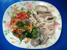 เป็นอาหารรสจัดคล้ายผัดกระเพราโดยนำ กุ้ง หมึก หอยมาผัดรวมกับเครื่องเทศได้แก่ กระชาย พริกไทยอ่อน มะกรูด กระเพรา