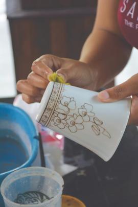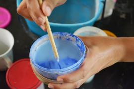 นำสีผงผสมกับน้ำ หลังจากนั้นทำการเกลี่ยสี คือ จะนำน้ำผสมกับเนื้อสี และ คนให้เป็นเนื้อครีม โดยน้ำต้องไม่เยอะจนเกินไป เพราะถ้าน้ำเยอะเกินไปจะทำให้สีไหลออก แต่ถ้าลงสีโดยไม่มีน้ำเลยก็จะทำให้สีหนืด และ ลงสีไม่ได้ ถ้ารู้สึกว่าสีในพู่กันเริ่มน้อยก็ค่อยๆปาดสี