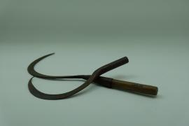 เครื่องมือเกี่ยวข้าว และหญ้า เป็นต้น ทำด้วยเหล็กรูปโค้งพระจันทร์เสี้ยว มีคมมีด้ามจับ.