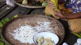 เป็นขนมพื้นบ้านของชนพื้นเมืองเขมรถิ่นไทย ในพื้นที่ตำบลลำดวนก็เช่นเดียวกัน โดยวิถีชีวิตความเป็นอยู่ของชาวบ้านในชนบทจากวัสดุตามธรรมชาติที่อยู่รอบตัว ใช้ใบไม้ ใบของต้นกล้วย ใบมะพร้าว ดอกผล รากเหง้าของต้นไม้ มาประกอบเป็นอาหาร และเมื่อต้องการเพิ่มรสชาติ หรือสีสัน ก็ใช้ยอด ใบ ผลของพืชต่างๆ นำมาผสมปรุงแต่งให้มีรสชาติสีสัน ตามต้องการ ขนมพื้นบ้านไทยไม่เพียงแต่มีรสชาติที่อร่อยกลมกล่อม หลากหลายรส แต่ยังเป็นเอกลักษณ์ที่บ่งบอกถึงวัฒนธรรมและภูมิปัญญาของคนพื้นถิ่น ในแต่ละท้องถิ่นที่ปรุงแต่งให้เป็นอาหารพื้นบ้าน