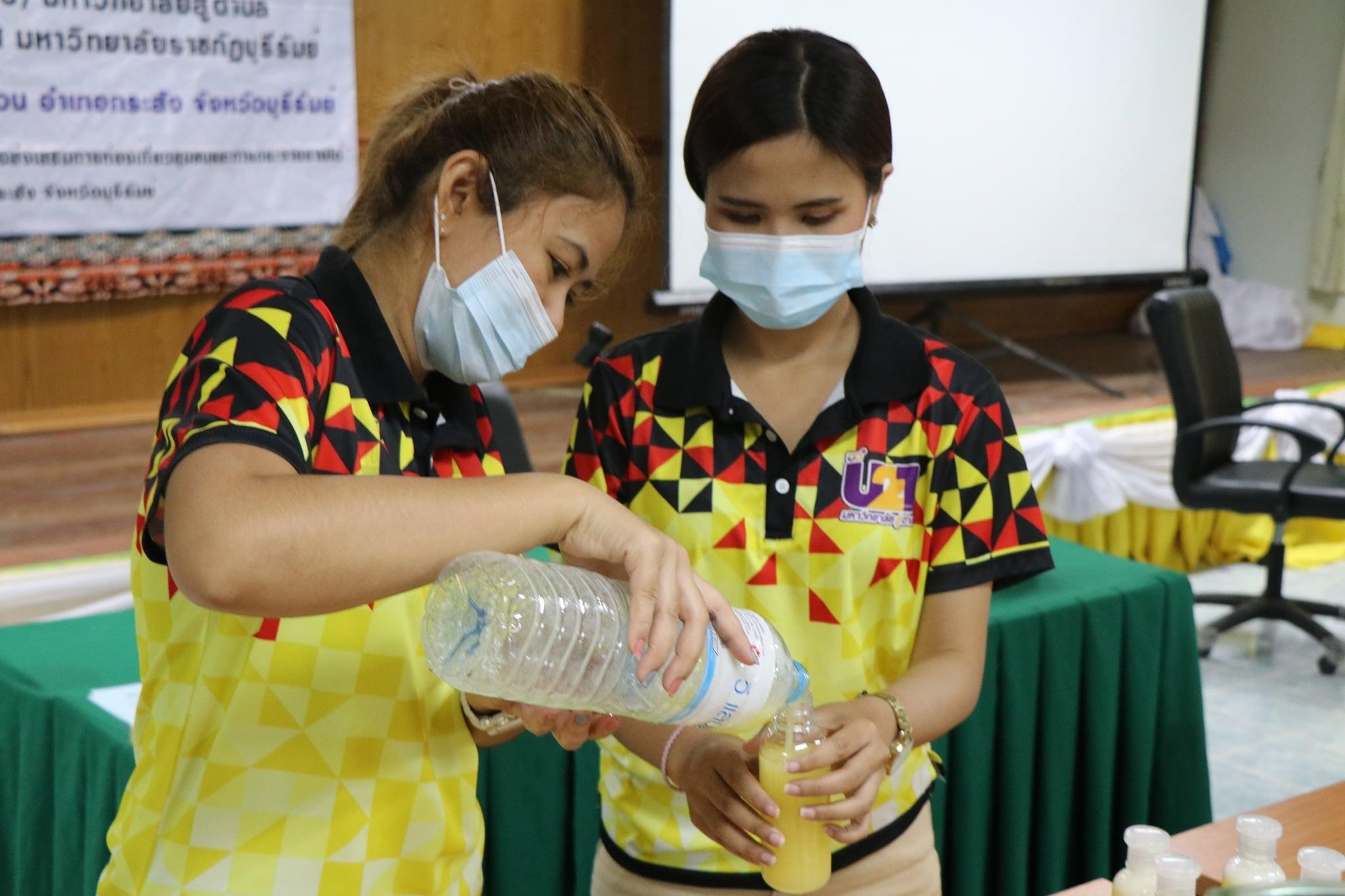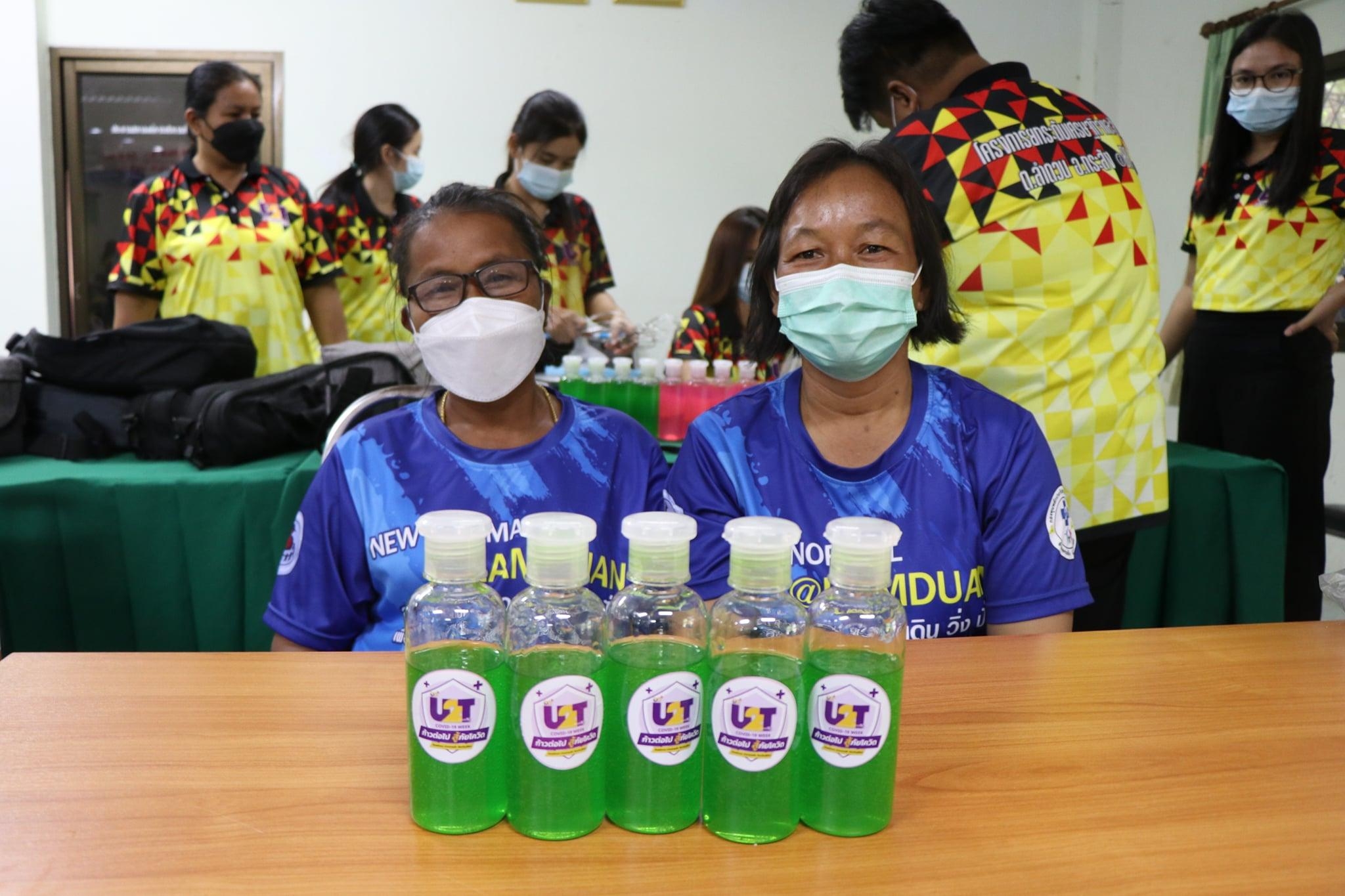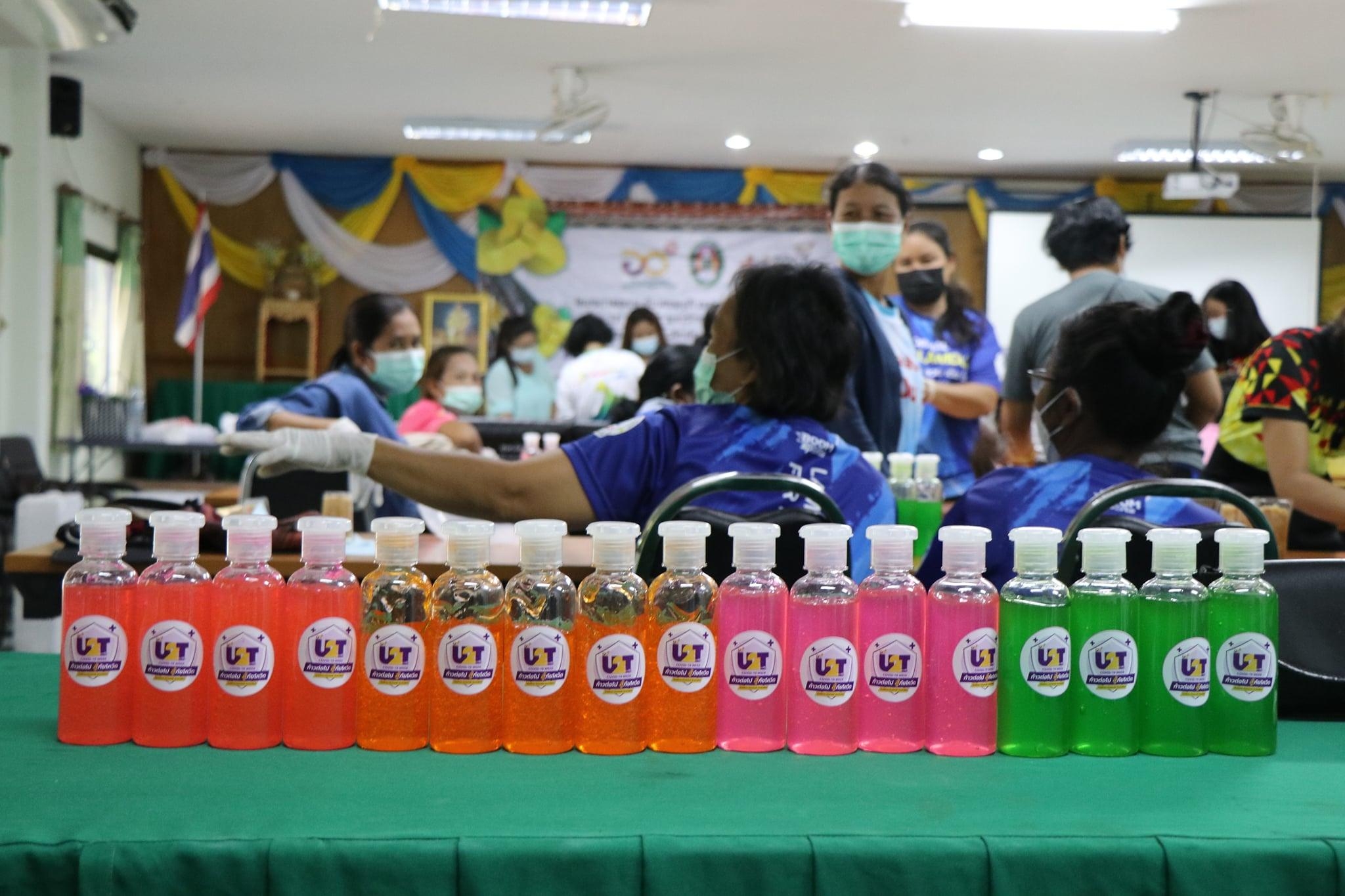 เมื่อวันที่ 26 กรกฎาคม 2564 จัดกิจกรรมทำเจล โดยทีมผู้ปฏิบัติงาน ได้จัดการการอบรมเชิงปฏิบัติการทำเจล และ สบู่เหลว ให้กับกลุ่ม อสม.ในตำบลลำดวน จำนวน 36 คน ซึ่งเป็นตัวแทนจาก 18 หมู่บ้าน ซึ่งทาง อสม.ต่างก็ให้ความร่วมือเป็นอย่างดี ทำให้ได้รับความรู้และสามารถนำไปประกอบอาชีพเสริมได้ อีกทั้งสามารถนำกลับไปอบรมให้แก่ชุมชนของตน เพื่อใช้ในการประดิษฐ์สิ่งที่ต้องใช้ในชีวิตประจำวันมากขึ้น เนื่องด้วยสถานการณ์โควิด-19 ที่เพิ่มขึ้นเรื่อยๆ การให้ความสำคัญในเรื่องนี้จึงได้รับความร่วมมือจากกลุ่ม อสม.เป็นอย่างดี “การทำผลิตภัณฑ์น้ำยาซักผ้าไหม จากเส้นไหม”ประโยชน์และสรรพคุณ Silk Protein Liquid Soap ด้วยสรรพคุณของโปรตีนไหม (Silk Protein) หรือเซริซีน (Sericin) ที่สกัดได้จากรังไหม เซริซีน มีสารสำคัญบางชนิดที่ช่วยป้องกันผิดแห้ง ลดการเจริญเติบโตของไวรัส มีสารต้านไวรัส อีกทั้งกรดอามิโน 16-18 ชนิด จาการวิจัยพบว่า เซริซีน มีฤทธิ์ต้านอนุมูลอิสระ ยับยั้งการทำลายเซลล์ โดย oxygen free radicals ผลิตภัณฑ์ซักผ้าไหม จากเส้นไหม จุดเด่นสำคัญคือการใช้โปรตีนไหมบ้านแท้ ปลอดภัยไม่มีสารอันตราย เมื่อใช้แล้วทำให้ผ้าไหม มีสีสดสวยผ้าไม่หงอก สปริงตัว สามารถซ่อมแซมเส้นใยผ้า คืนความนุ่นของผ้าไหม ต้านเชื้อแบคทีเรียบางชนิดซึ่งเป็นสาเหตุของ โรคผิดหนัง เมื่อสวมใส่แล้วทำให้รู้สึกเย็นสบายไม่อับชื้น