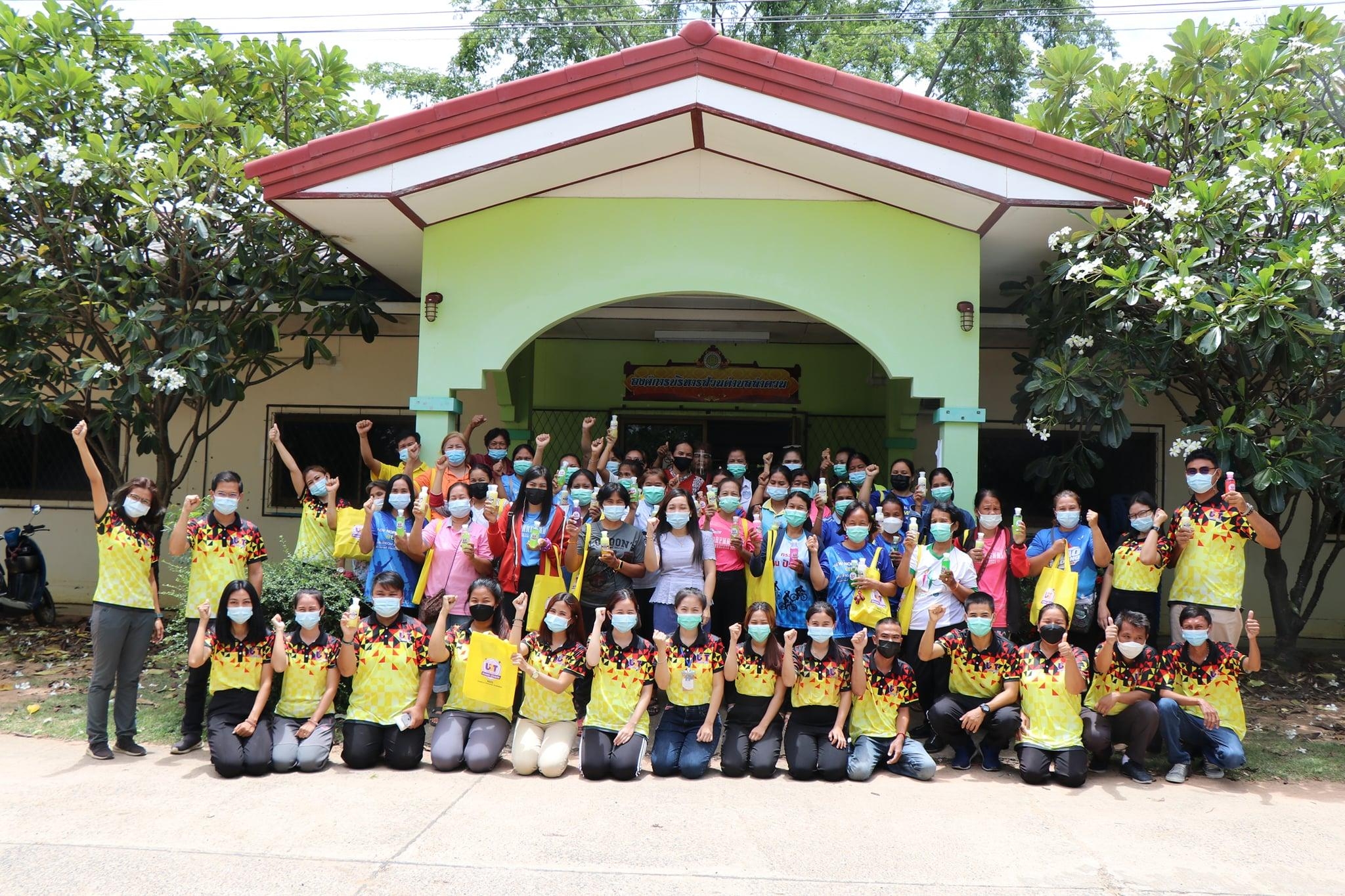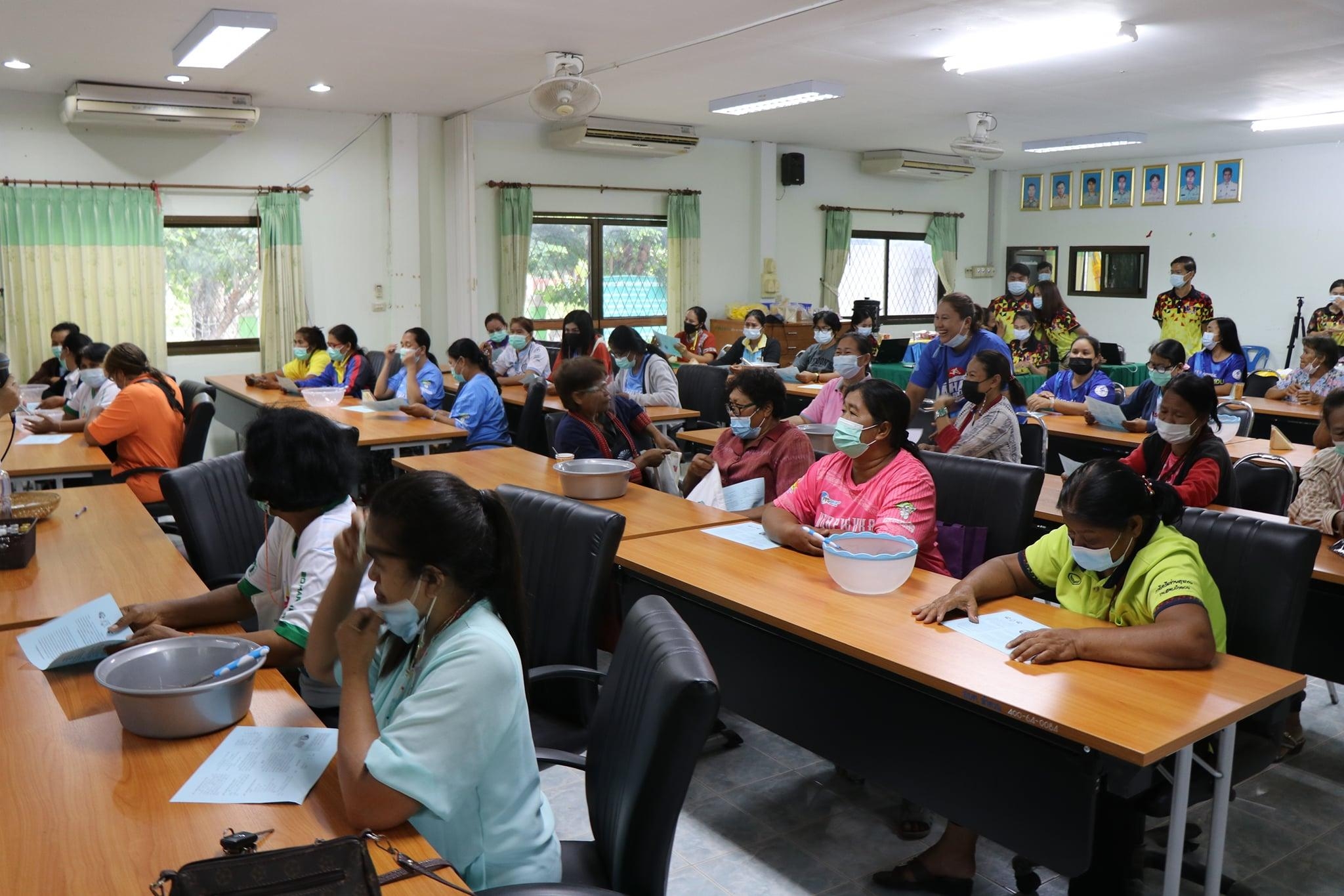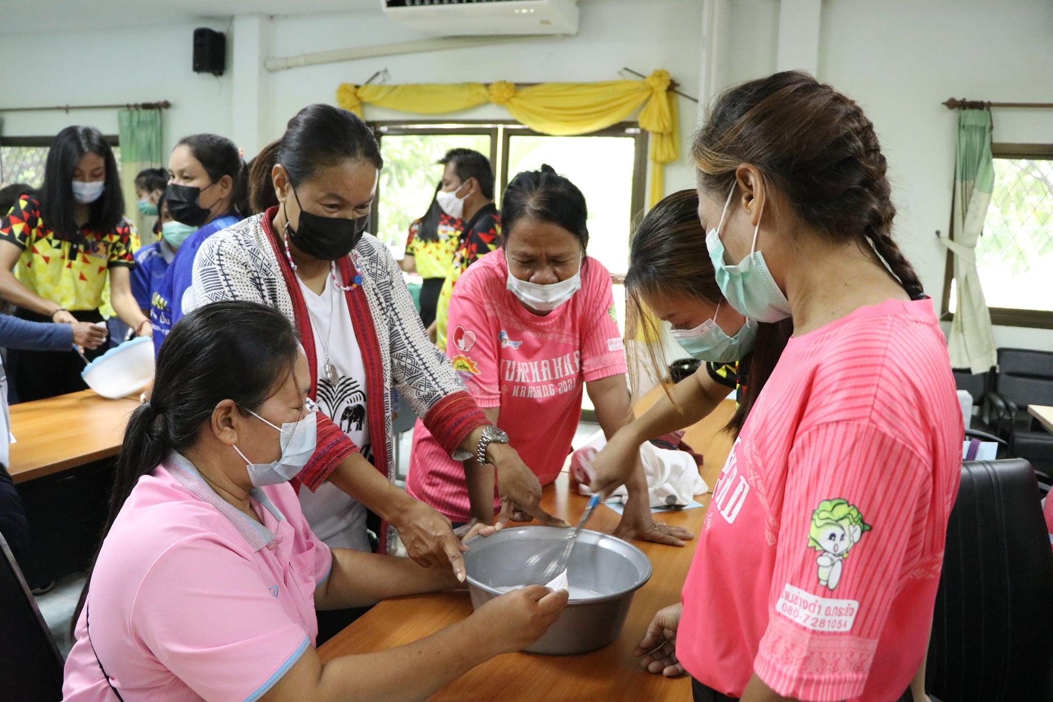 เมื่อวันที่ 26 กรกฎาคม 2564 จัดกิจกรรมทำเจล โดยทีมผู้ปฏิบัติงาน ได้จัดการการอบรมเชิงปฏิบัติการทำเจล และ สบู่เหลว ให้กับกลุ่ม อสม.ในตำบลลำดวน จำนวน 36 คน ซึ่งเป็นตัวแทนจาก 18 หมู่บ้าน ซึ่งทาง อสม.ต่างก็ให้ความร่วมือเป็นอย่างดี ทำให้ได้รับความรู้และสามารถนำไปประกอบอาชีพเสริมได้ อีกทั้งสามารถนำกลับไปอบรมให้แก่ชุมชนของตน เพื่อใช้ในการประดิษฐ์สิ่งที่ต้องใช้ในชีวิตประจำวันมากขึ้น เนื่องด้วยสถานการณ์โควิด-19 ที่เพิ่มขึ้นเรื่อยๆ การให้ความสำคัญในเรื่องนี้จึงได้รับความร่วมมือจากกลุ่ม อสม.เป็นอย่างดี “การทำผลิตภัณฑ์น้ำยาซักผ้าไหม จากเส้นไหม”ประโยชน์และสรรพคุณ Silk Protein Liquid Soap ด้วยสรรพคุณของโปรตีนไหม (Silk Protein) หรือเซริซีน (Sericin) ที่สกัดได้จากรังไหม เซริซีน มีสารสำคัญบางชนิดที่ช่วยป้องกันผิดแห้ง ลดการเจริญเติบโตของไวรัส มีสารต้านไวรัส อีกทั้งกรดอามิโน 16-18 ชนิด จาการวิจัยพบว่า เซริซีน มีฤทธิ์ต้านอนุมูลอิสระ ยับยั้งการทำลายเซลล์ โดย oxygen free radicals ผลิตภัณฑ์ซักผ้าไหม จากเส้นไหม จุดเด่นสำคัญคือการใช้โปรตีนไหมบ้านแท้ ปลอดภัยไม่มีสารอันตราย เมื่อใช้แล้วทำให้ผ้าไหม มีสีสดสวยผ้าไม่หงอก สปริงตัว สามารถซ่อมแซมเส้นใยผ้า คืนความนุ่นของผ้าไหม ต้านเชื้อแบคทีเรียบางชนิดซึ่งเป็นสาเหตุของ โรคผิดหนัง เมื่อสวมใส่แล้วทำให้รู้สึกเย็นสบายไม่อับชื้น