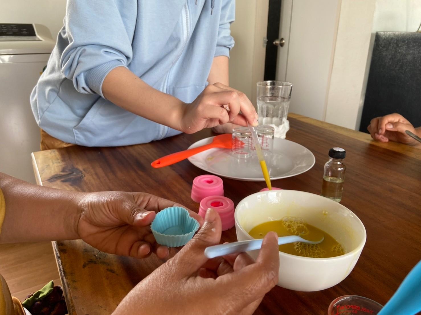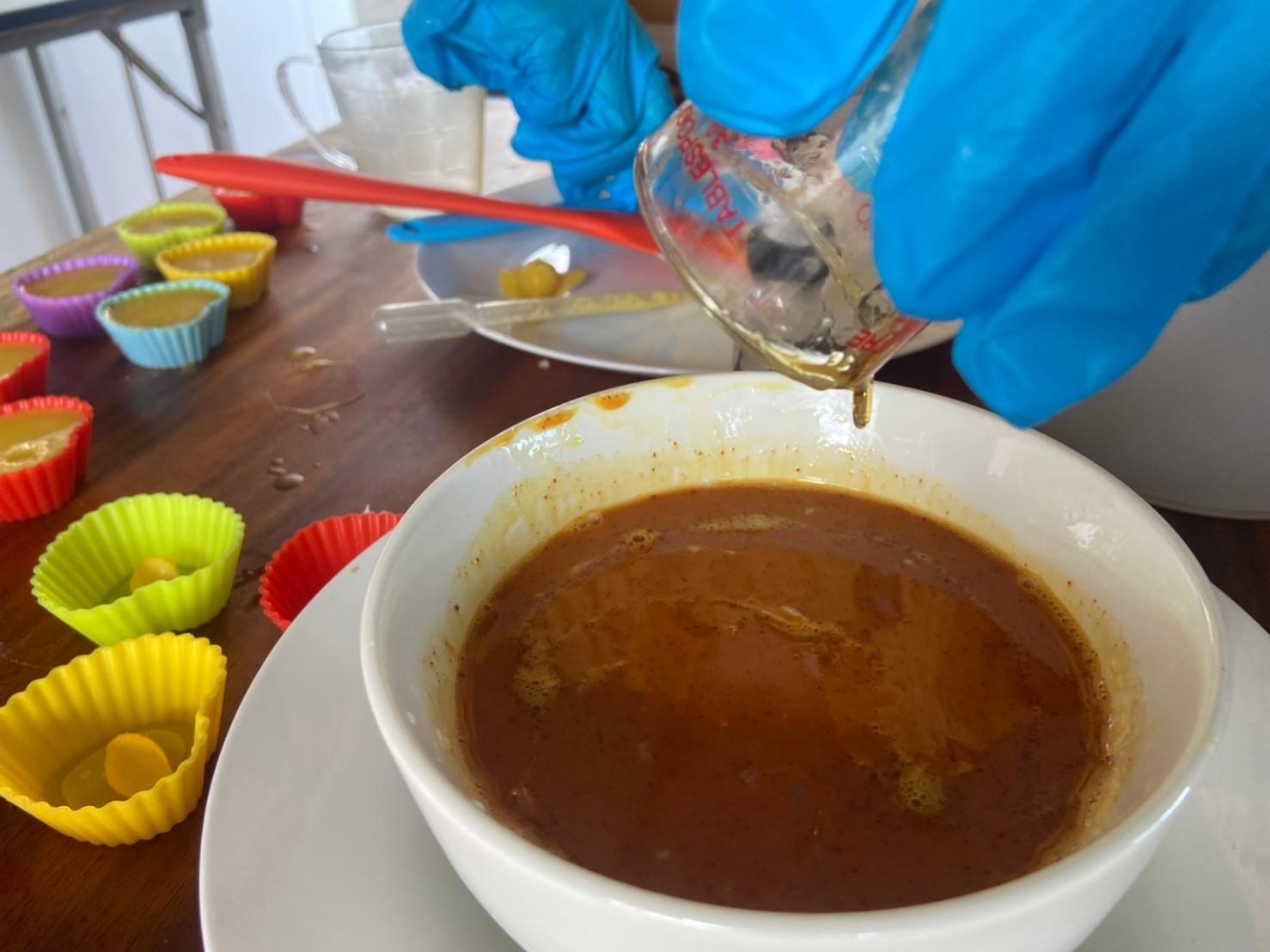 3.นำกลีเซอรีนที่ผสมแล้ว มาเทใส่พิมพ์(สบู่) ที่เตรียมไว้