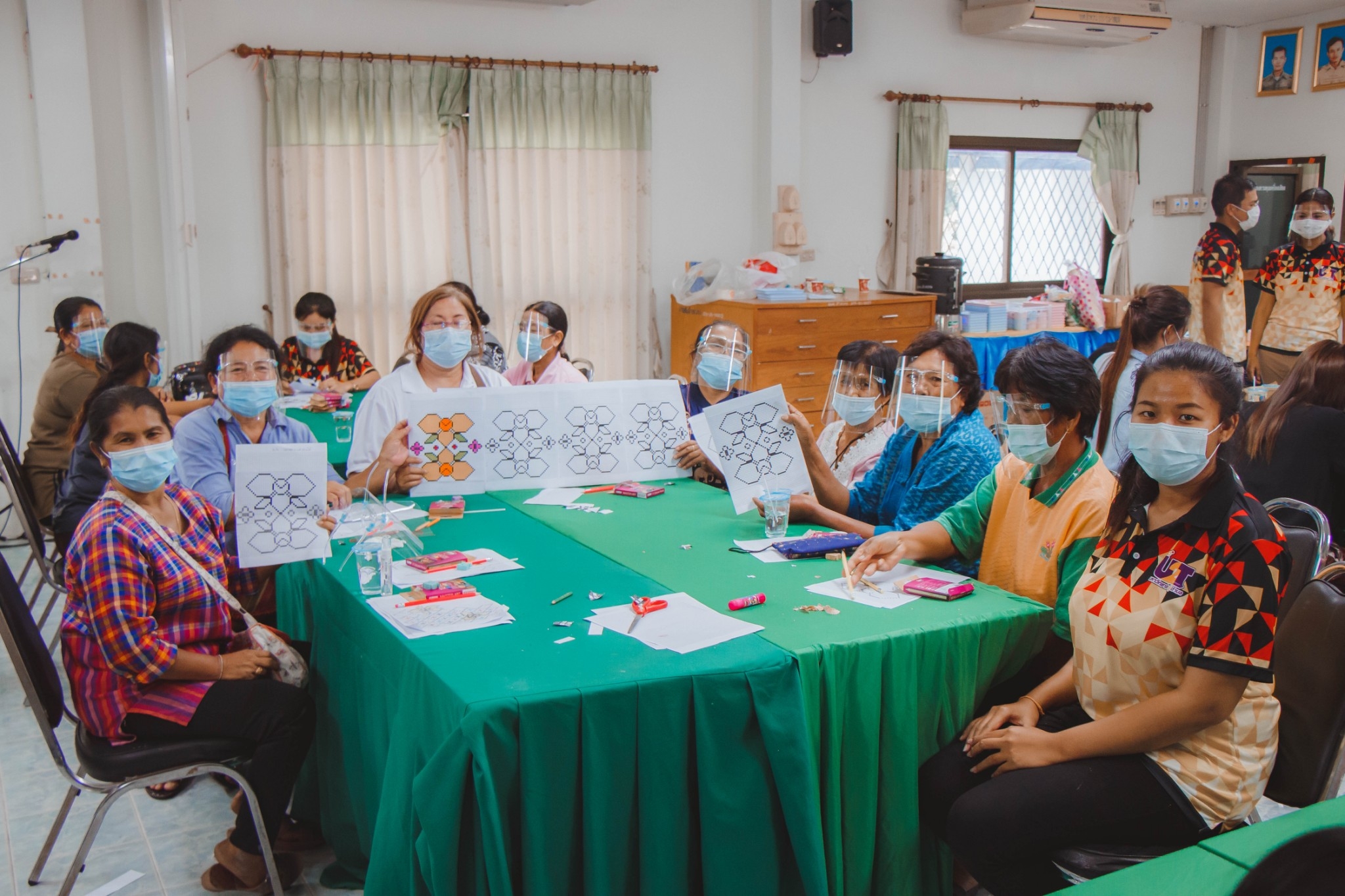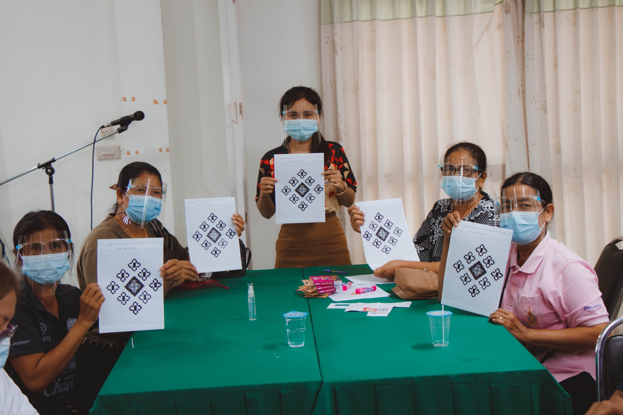พร้อมออกแบบลวดลาย หลังจากที่อาจารย์ ดร.สินีนาฏ รามฤทธิ์ บรรยายเรียบร้อยแล้วได้ให้ชาวบ้านช่วยกันคิดลายอัตลักษณ์ประจำตำบลลำดวน