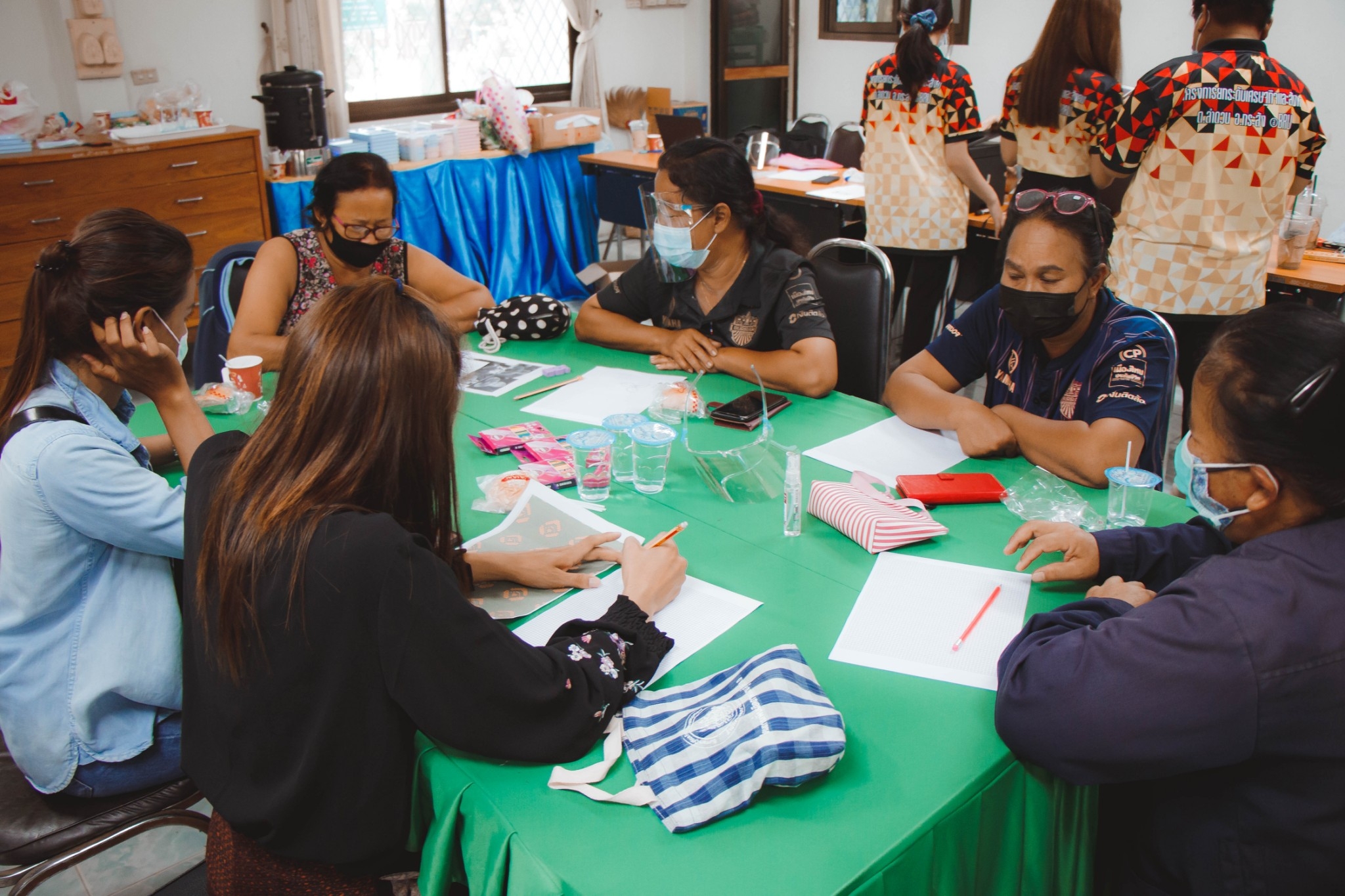 และให้ชาวบ้านช่วยออกความคิดเห็นว่าอยากนำผ้าทอมาแปรรูปเป็นอะไรได้บ้าง ทำกระเป๋า