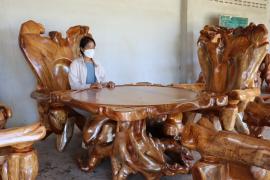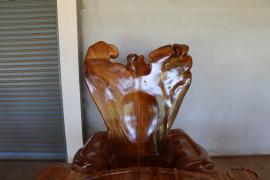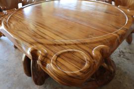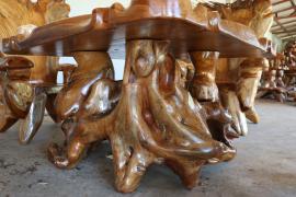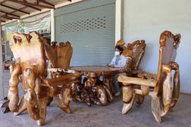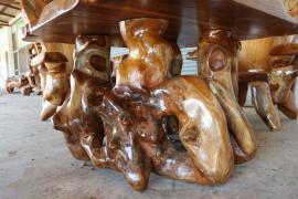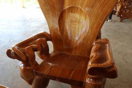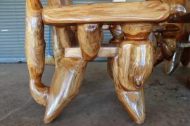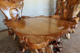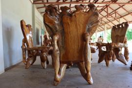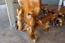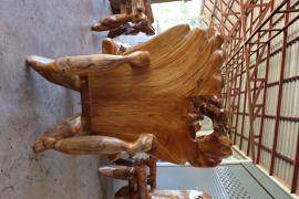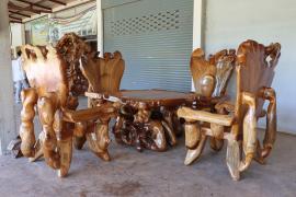 งานปฏิมากรรมที่เกิดจากตอไม้สักกลายเป็นชุดรับแขกเหมาะสำหรับเป็นโต๊ะรับแขกกลางแจ้ง หรือจัดสวนในพื้นที่ที่มีบริเวณบ้านกว้างขวาง