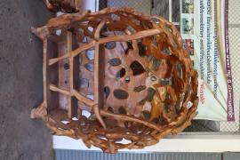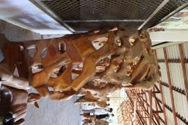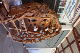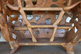 ชั้นวางทีวีและวางของที่เกิดจากการนำรากไม้สักมาต่อกันเป็นชั้น ๆ ทำให้วางของได้หลายอย่างจึงใช้งานได้แบบอเนกประสงค์
