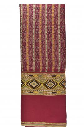 ซิ่นหมี่ตา ใช้เทคนิคมัดหมี่สลับกับการจกหรือขิด ทำให้เกิดลวดลายขนานกับลำตัวลวดลายของมัดหมี่จะเป็นลายหงส์หรือนาคเป็นส่วนใหญ่ "อายุประมาณ 100 ปี"