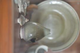 แจกันขนาดเล็ก ลำตัวป่องออกไล่จากก้นมาถึงไหล่ ก้นตัดกับตัวแจกันสีน้ำตาลไม่เคลือบ คอสั้น ปากเล็ก เคลือบด้วยสีเขียวมรกต