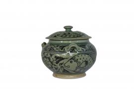 ตะเกียง ประกอบด้วย ตัวสีอันซ้อนกันเป็นชั้น โดยการนำเอาฐานของกระปุกหรือโถมาเรียงกัน ด้านบนมีฝาปิด พร้อมกับวาดลวดลายสวยงามตกแต่งและเคลือบด้วยสีเขียวมรกต