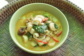 Gaeng Yuak Sai Thua Khiew Giew Mue(แกงหยวกใส่ถั่วเขียวเกี่ยวมือ) Banana Stem and Mung Bean Curry)