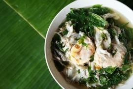 ผักหวาน เป็นผักท้องถิ่นที่สามารถหาได้ตามป่า บางบ้านอาจมีการปลูกผักชนิดนี้ ถือเป็นวัตถุดิบที่หาง่าย ขั้นตอนเริ่มจากการต้มน้ำให้เดือด ใส่เครื่องปรุงต่างๆ เช่น น้ำปลา น้ำตาล ซอสขาว ตามด้วยผักหวานและไข่ทั้งฟอง ค่อยๆ คนให้ผักและไข่สุกพร้อมกัน รับประทานพร้อมข้าวสวยร้อนๆ