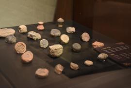 ตราดินเผารูปสัญลักษณ์ทางศาสนาประกอบอักษรโบราณ พบที่เมืองโบราณอู่ทอง อำเภออู่ทอง จังหวัดสุพรรณบุรี จัดแสดง ณ ห้องบรรพชนคนอู่ทอง พิพิธภัณฑสถานแห่งชาติ อู่ทอง ตราดินเผา คือ โบราณวัตถุที่มีรูปรอยนูนขึ้นจากพื้นผิวในลักษณะนูนต่ำ เป็นรอยถูกประทับ (Stamp) ตราประทับและตราดินเผามีหลักฐานว่าถูกใช้เป็นเครื่องมือสื่อสารของคนในสมัยโบราณมาตั้งแต่สมัยเมโสโปเตเมีย และอินเดียโบราณ โดยเริ่มจากการใช้รูปแบบเรียบง่าย ต่อมามีการพัฒนารูปทรงและลวดลายที่สวยงาม ซับซ้อน แสดงถึงสัญลักษณ์ความเชื่อ