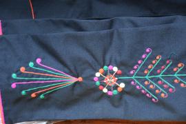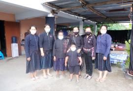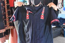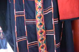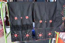 การแต่งกายไทยทรงดำ เน้นด้วยผ้าสีดำหรือสีกรมท่า โดยแบ่งออกเป็นของผู้ชายและผู้หญิง การแต่งกายผู้ชาย คือ ใส่เสื้อไท ติดกระดุมเงินตั้งแต่ 11 เม็ดขึ้นไป สวมซ่วงก้อม (กางเกงขาสั้น) คาดด้วยสายคาดเอว ใส่เสื้อฮีชายในชุดพิธีกรรม การแต่งกายผู้หญิงคือ ใส่เสื้อก้อมติดกระดุมเงินไม่เกิน 11 เม็ด ผ้าซิ่นลายแตงโม ทรงหน้าวัว หรือหน้าสั้นหลังยาว พาดบ่าด้วยผ้าเปียว สะพายกะเหล็บ ใส่เสื้ออีหญิงในชุดพิธีกรรม ผ้าทอของชาวไทยทรงดำ หรือลาวโซ่ง เป็นเอกลักษณ์เฉพาะกลุ่มชน ผ้าที่ทอมีอยู่ 4 ชนิด คือ ผ้าฝ้าย ผ้าไหม ผ้าซิ่นลายแตงโม และผ้าตีนซิ่น ขั้นตอนในการทอผ้านั้นจะเริ่มจากการปลูกฝ้าย ปลูกหม่อนเลี้ยงไหมกันกันเอง และนำดอกฝ้าย หรือไหม มาปั่น / สาว เป็นด้ายทอเป็นผืน ส่งผลให้การทอผ้าสืบทอดกันต่อมาเป็นวัฒนธรรมการแต่งกายที่นิยมทอ ใช้เองมาจนปัจจุบัน