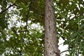 ลักษณะทางพฤกษศาสตร์ : ไม้ต้นขนาดกลางผลัดใบมีความสูง 8 – 15 เมตร ลำต้นมีสีเทามีหนามตามต้นและกิ่งก้านใบเรียงเวียนกันเป็นกลุ่มตามปลายกิ่ง โคนใบสอบแคบ ปลายใบเรียวแหลม พืชดอกเดี่ยวมีสีขาว กลีบดอกมีสีครีมอมม่วง ผลรูปกระสวยทรงกระบอกผิวแข็ง พบขึ้นตามป่าเบญจพรรณและเขาหินปูน