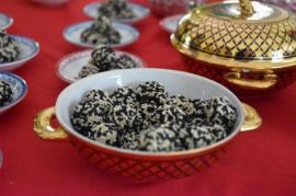 ขนมไทยประยุกต์ของบ้านขนมหอม ที่ตั้งชื่อตามลูกปัดโบราณเมืองอู่ทอง ขนมทำจาก แป้งข้าวเหนียวดำกวนกับกะทิและน้ำตาล พอปั้นเสร็จนำไปคลุกด้วยงาคั่ว