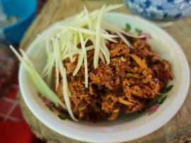 น้ำพริกพื้นบ้านของชุมชนลาวครั่ง มีส่วนประกอบคือ พริกแห้ง หอมแดง กระเทียม ที่นำมาคั่ว แล้วจึงมาโขลกรวมกันเนื้อปลา